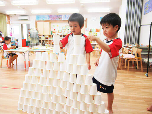 長町幼稚園では、子どもたち自身が主体的に考える力、 表現しようとする意欲、やってみたいという好奇心、 それらによって遊びを作り出す力を育む保育を実践しています。